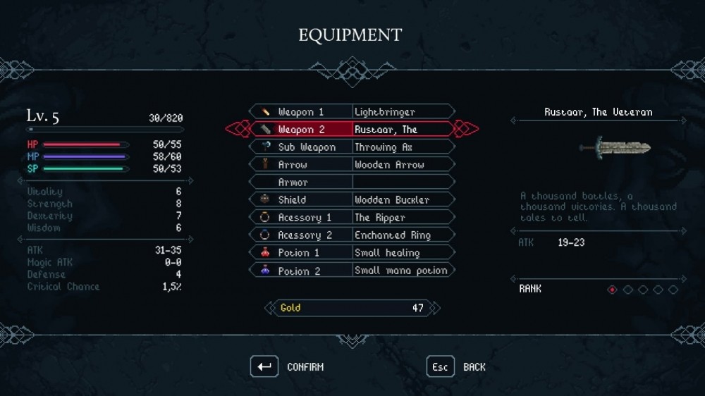 Во время изучения полуоткрытого мира персонаж находит различный лут. В игре герой может носить броню, щит, два кольца, пару типов зелий, восполняющих здоровье или ману, два основных оружия и одно второстепенное, а также расходные предметы, вроде колчана со стрелами. Разнообразная экипировка позволяет создавать билды под свой стиль боя. Её можно покупать у дружественных NPC за собранное или заработанное золото.
