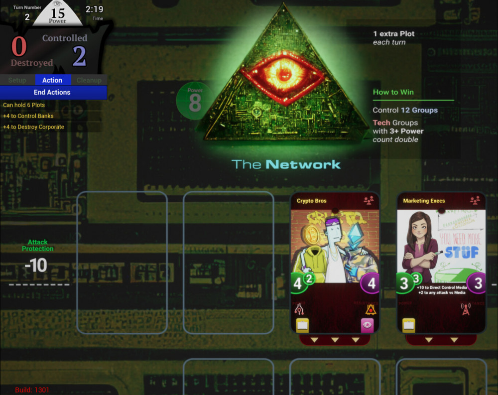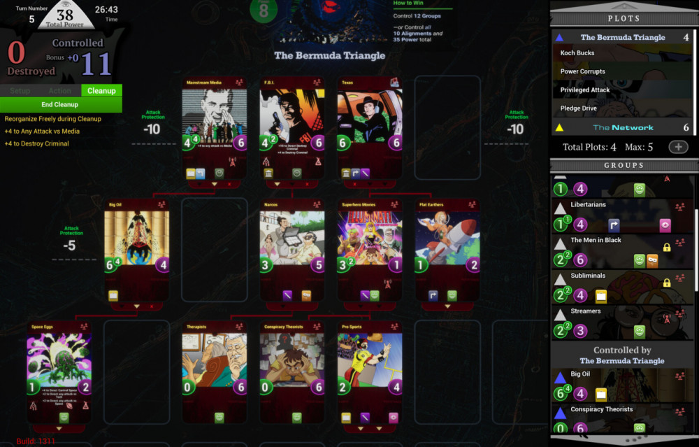 Игра охватывает три исторических периода с оригинальными колодами 1980-х, 1990-х и современной эпохи. Каждая эра отражает свои теории заговора и общественные настроения, создавая уникальные стратегические условия. Кроме управления группировками, есть 112 карт Интриг, которые тянешь каждый ход. Они позволяют менять базовые правила игры, давать себе преимущества или создавать проблемы соперникам.