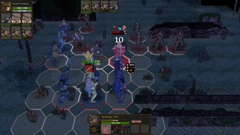 Боевая система завязана на пошаговых сражениях на клеточной карте. Король Нрвеск - это центр всего, и если его грохнут, игра кончается. Враги не дремлют: они координируются, вытягивают твоих бойцов с позиций, расставляют ловушки, делают фланговые манёвры. Нужно серьёзно изучать их слабости и постоянно защищать главного героя, потому что весь поход держится на его выживании.