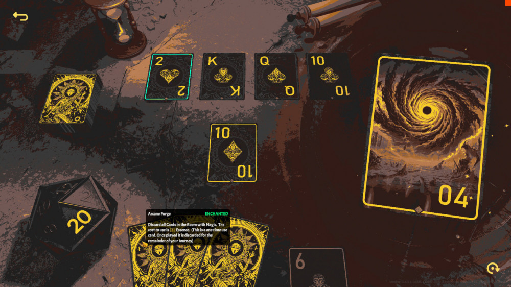 Геймплей переосмысляет механики игры Scoundrel, добавляя эзотерическую атмосферу и глубину повествования. Руины "запоминают" твои действия, и каждый заход уникален, так как маршруты и встречи никогда не повторяются. Твоя задача пройти Испытания, спуститься глубже и узнать, что скрывается в недрах храма, балансируя между удачей и стратегией.