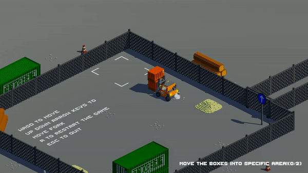 Это аркадный симулятор вилочного погрузчика. В Pixel Forklift Simulator нужно кататься на складском транспорте и перемещать ящики. В управлении задействовано всего 6 клавиш на клавиатуре. W, A, S, D отвечают за газ, тормоз и повороты влево или вправо. Стрелки "вверх" и "вниз" позволяют поднимать и опускать вилы. Есть ещё 4 кнопки. С их помощью можно сменить ракурс, перезапустить этап и выйти в меню соответственно. Геймпады тоже поддерживаются.