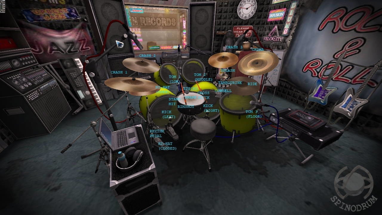 Игра использует настоящие звуки барабанов, которые были записаны в студии в Стамбуле. Вы можете импортировать треки и играть под фонограмму и любимые мелодии. В Spinodrum можно менять внешний вид ударной установки, включая 6 тарелок, тома: басовые, альт, рабочий и т.д.