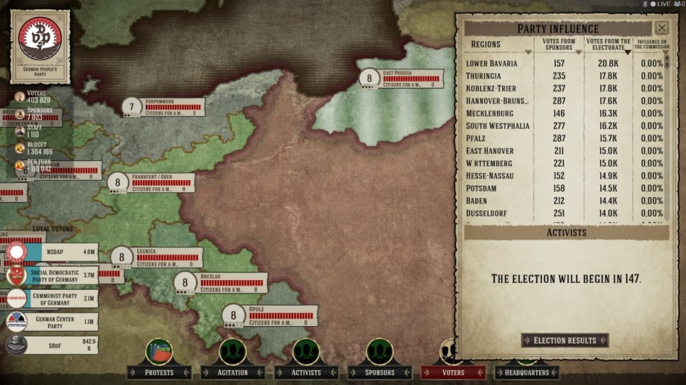 Однопользовательская кампания состоит из трёх доступных сценариев по странам, что разделены на 70 регионов. Нужно добывать доверия в ключевых районах для получения большинства голосов. Геймер получает возможность переписать европейскую историю при помощи своих решений, что принимаются во время прохождения, ведь пользователь выбирает из 29 настоящих партий, что существовали в те времена.