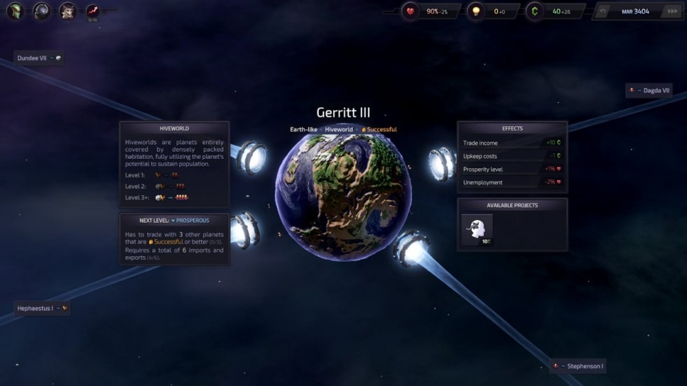 Требуется колонизировать планеты, выбирать отрасли развития, соединять их между собой, чтобы они могли взаимодействовать и т.п. Геймплей направлен на торговлю, а не войну. Здесь важно развивать именно торговые отношения. Позволяется заключать договора, открывая новые пути снабжения или же выстраивая долгосрочные планы с той или иной компанией. Всего доступно 6 разных планет. Каждая из них представлена уникальными ресурсами и технологиями. Предстоит проявить себя как экономического стратега, забыв про язык силы. Лишь менеджмент и умение дипломатии позволит быстро расширить сферу своего влияния.