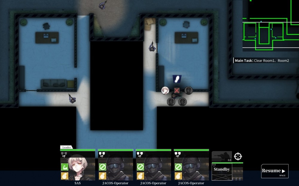 Ключевая механика заключается в том, что для каждого члена группы необходимо создавать отдельный маршрут. Для этого достаточно нарисовать курсором линию, чтобы боец перешел в конечную точку. На первых уровнях это не будет иметь принципиального значения, но далее тактика обретет смысл. Например, при входе в помещение, нужно будет расположить юнитов таким образом, чтобы они прикрывали друг-друга. Чтобы неожиданно ворваться в помещение, можно использовать свето-шумовое устройство, а для устранения группы противников подойдет боевая граната.