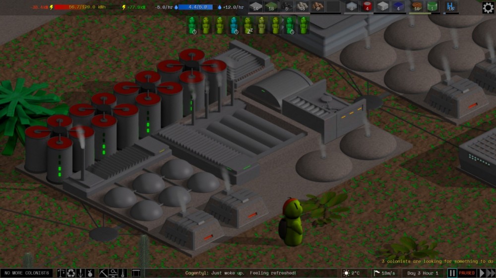 Игроку предстоит управлять углем, камнем, рудой и органикой. На старте развития необходимы камни и растительность, но постепенно потребуется добираться до драгоценных материалов. Подопечным нужна еда, а питательная смесь наносит ущерб счастью персонажей, хоть и легко производится. В новом мире множество съедобных и ядовитых плодов. Ботаники будут их собирать и дегустировать, чтобы выявлять лучшие виды. Инструменты помогут вспахать землю и посадить культуры.