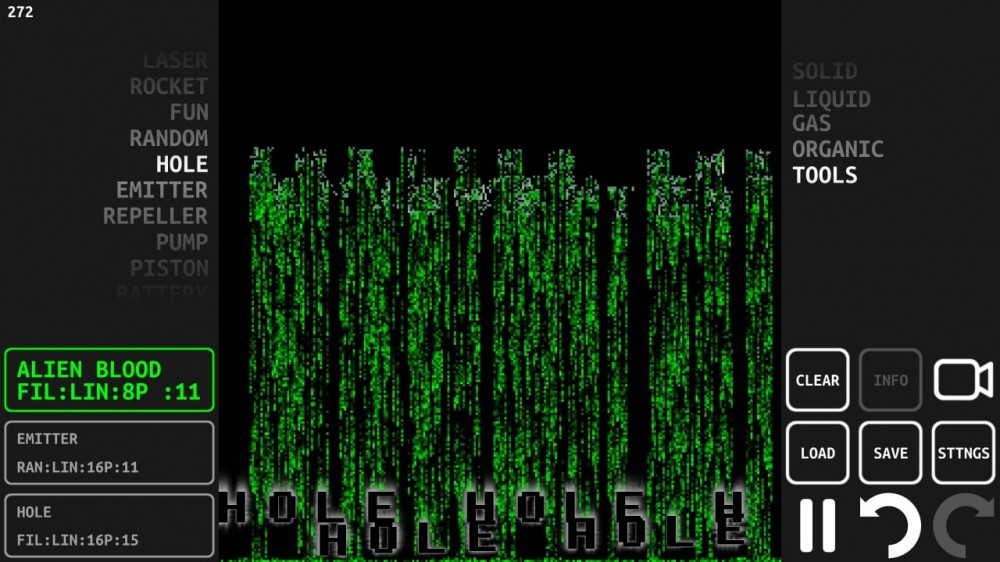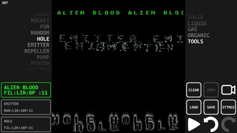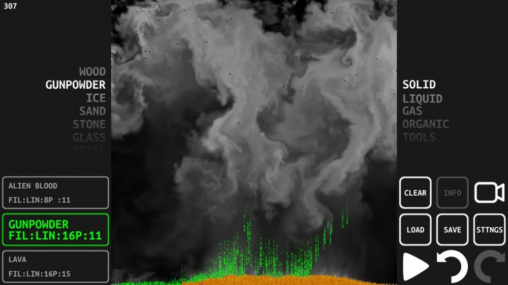 Пользователи могут сочетать эти объекты, как им вздумается, а затем наблюдать за их взаимодействиями и реакциями. Вдобавок можно оказывать на них дополнительное влияние с помощью излучения и различных стихий. Например: ветра. Всё вместе это позволяет геймерам устраивать пожары, взрывы, задымления, а также всячески менять ландшафт. В проекте имеется встроенный редактор, что похож на простые графические программы, позволяющий создавать собственные карты и события. Также есть список заранее созданных уровней. Фон у этапов по умолчанию темный, но можно загружать фотографии и картинки с ПК, а затем использовать их в качестве задника.