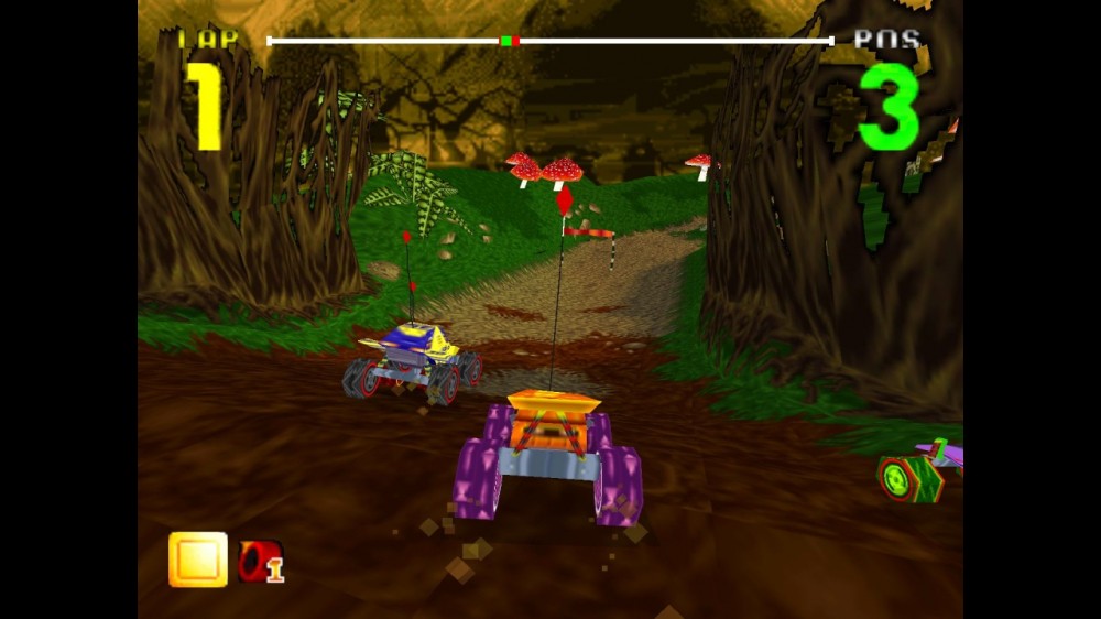 Тачек здесь 12 разновидностей. Они различаются между собой внешним видом и 4 параметрами: управляемостью, максимальной скоростью, ускорением, весом. А трасс здесь 16. Изначально большинство машинок и карт закрыто. Для получения доступа к ним нужно проходить одиночный контент. Все треки тут кольцевые. Все локации разнообразные. Поездки часто приходят на природе. Многие объекты, вроде тех же грибов, кажутся гигантскими на фоне крошечного транспорта.