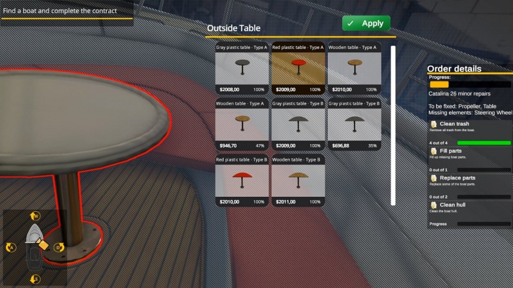 Декоративные элементы, краски и наклейки помогут воссоздать красочный интерьер. Редкие виды дерева, дорогая мебель, электронные приборы, телевизоры подойдут к услугам для миллионеров. В симуляторе механика предоставлено несколько видов лодок. Сюжетный режим предлагает начать с полного нуля и постепенно расширять мастерскую и чинить разные лодки. Задания генерируются процедурным образом, как и события.