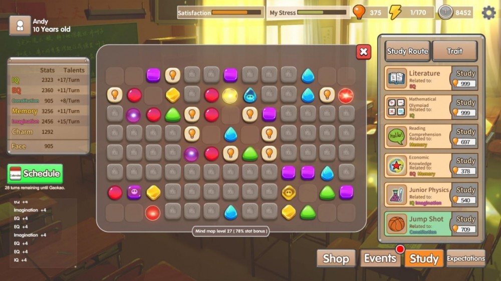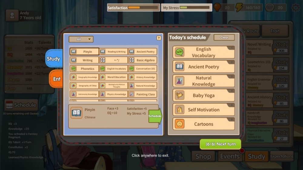 Суть игры состоит в том, чтобы прокачать своего протеже как можно лучше до наступления Гаокао. Так называются государственный вступительный экзамен, что позволяет попасть в серьезное образовательное учреждение и получить там высшее образование. Геймплей строится на мини-играх. В награду за их успешное прохождение улучшаются характеристики протагониста. Также присутствуют элементы текстового квеста. Здесь постоянно нужно принимать решения. Можно выстраивать отношения с 14 персонажами. Если герой или героиня успешно сдаст тест и найдет себе пару, то в конце создастся новая семья. Тогда станет доступным эндгейм-контент, где под контроль дадут их сына или дочь. При этом новый ребенок получит бонус в виде части достижений своих родственников.