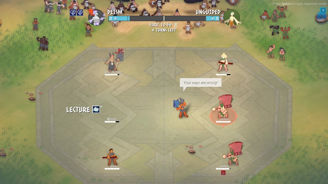 Свою правоту нужно доказывать в сражениях, реализованных в виде пошаговых боев. Персонажи обладают различными инструментами воздействия на противников – от устрашения до флирта. Геймер управляет отрядом из 3 бойцов, чьи характеристики можно прокачивать и получать усиления. Например, чем выше уровень Просвещения, тем сильнее будут новоприбывшие в лагерь ученики. Мощь своих поданных можно увеличить при помощи артефактов, получаемых из битв и случайных происшествий. Чем больше подношений совершают адепты, тем выше вероятность выпадения реликвии.