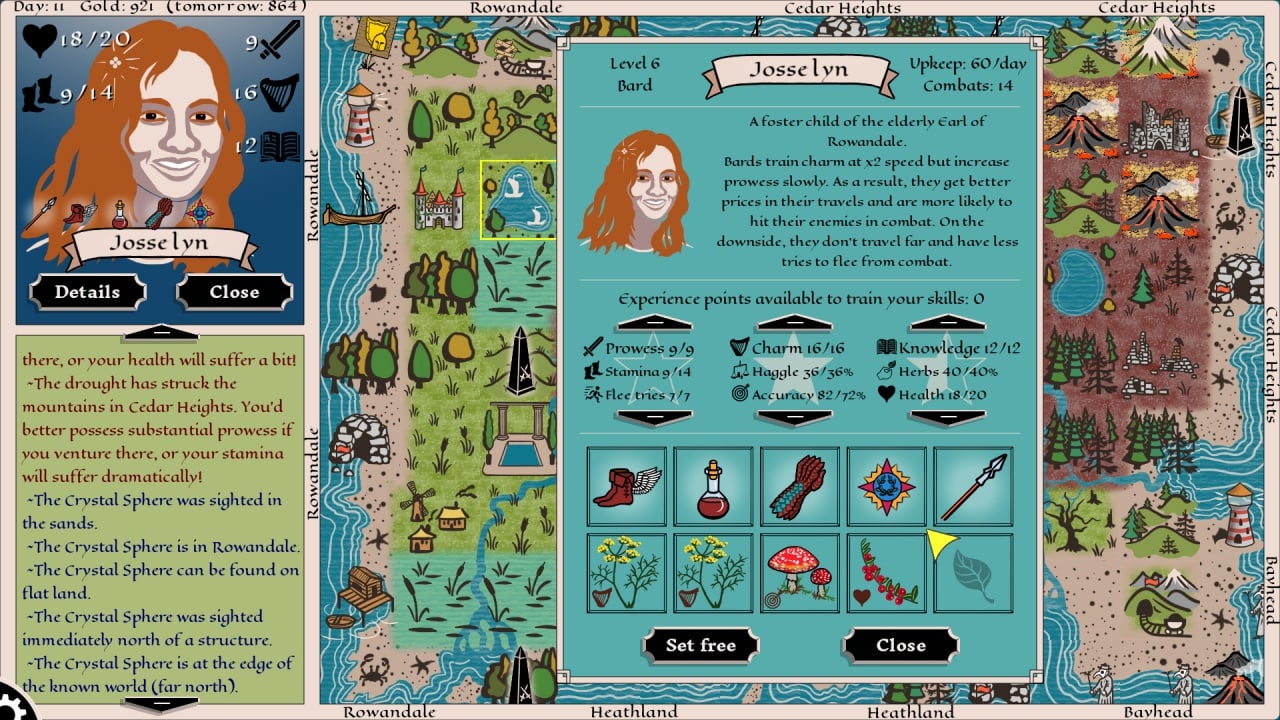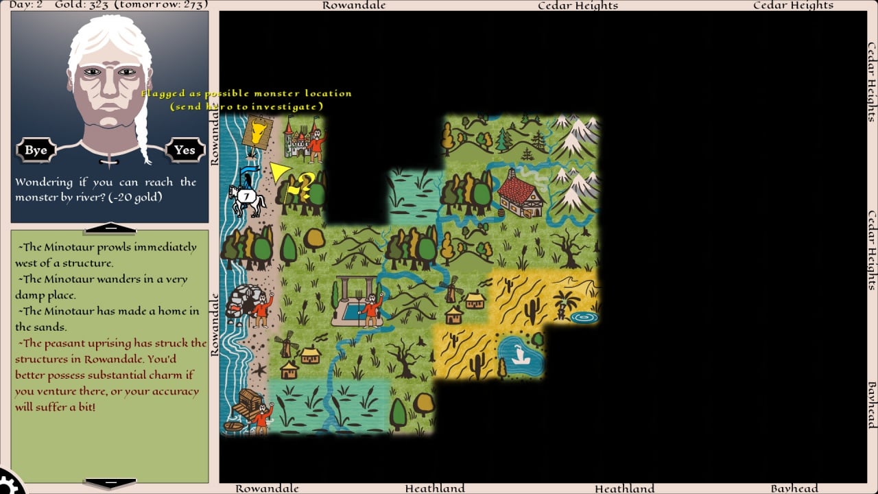 Глобальная карта процедурно генерируется и создает динамическую систему событий. Никогда игровой опыт не будет повторять предыдущий. Можно ставить отметки, чтобы обозначить интересные места или же покупать информацию в лавках. Некоторые сведения могут содержать в себе месторасположение чудовища, что позволит отыскать монстра, сэкономив время. Сражения построены по принципу камень-ножницы-бумага и проходят в пошаговом ключе.