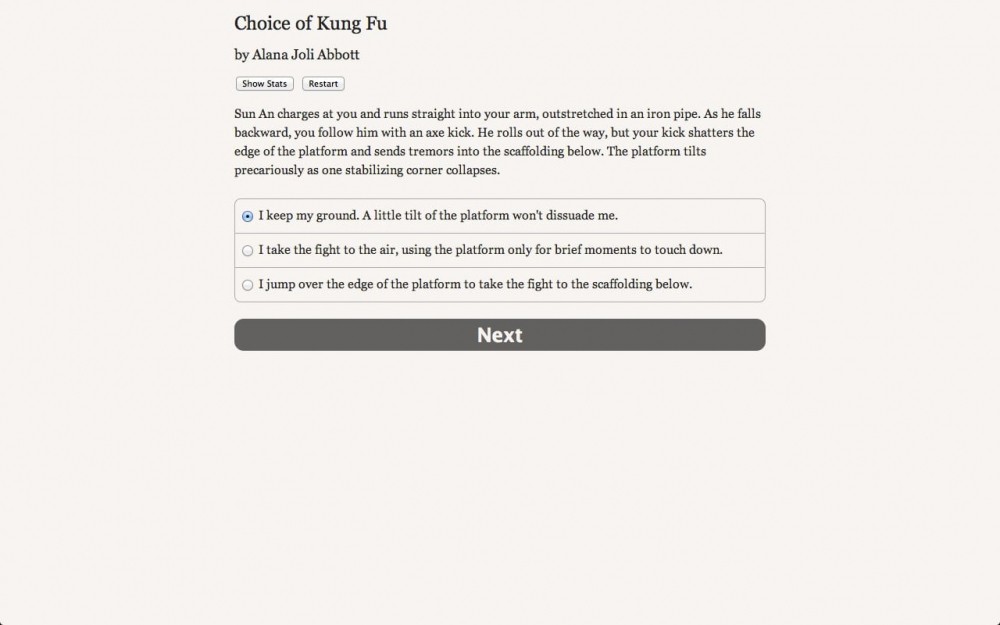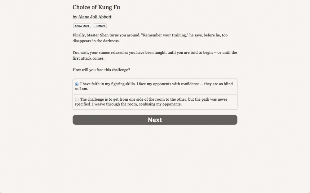 Choice of Kung Fu рассчитана на тех, кто любит текстовые игры. Здесь нет вообще графики и звуков. Вся информация подается только с помощью слов. По сути, это интерактивный роман. Геймплей заключается в чтении и выборе реплик или действий.