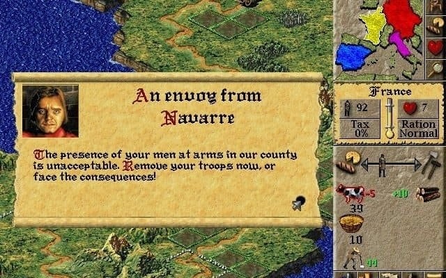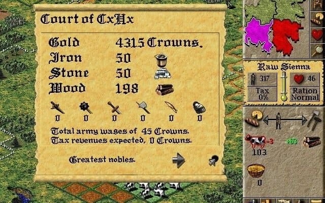 Для 1996 года разработчики придумали отличную экономическую систему. Здесь каждый персонаж занят своим делом. Он либо работает на каменоломне, либо руднике, либо трудится в кузнице или валит леса. Для каждого персонажа можно найти своё дело. Если человек занят работой, то его уровень счастья на высоте, но не забывайте, что есть множество факторов, влияющих на счастье. Если персонаж разочарован, то он соберет вещи и уйдет к вашему противнику. Вы сможете установить лимиты на ежедневное потребление провизии. Помните, что это отразится на будущем состоянии армии.