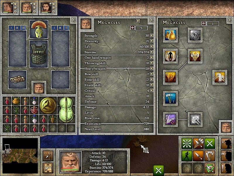 Специальные навыки героев можно развивать, получая уровни. По мере возрастания уровня героя, возможно увеличить его характеристики: сила, ловкость, жизнь, выносливость, метание, тяжелое оружие, лук, копье, щит и смертельный удар.