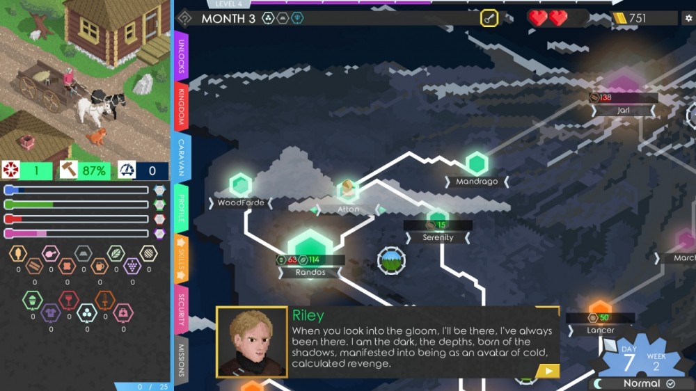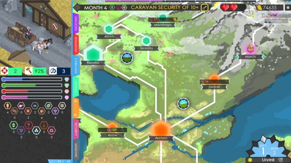 - Игрок путешествует по длительным дорогам, везя собственный караван. Наемники и герои помогут защищать его от постоянно нападающих бандитов.