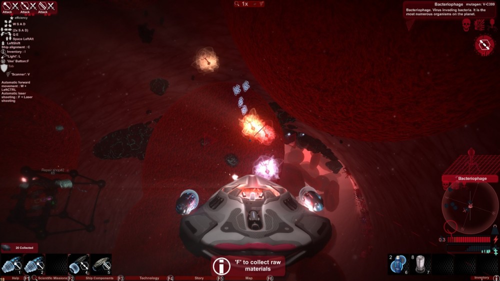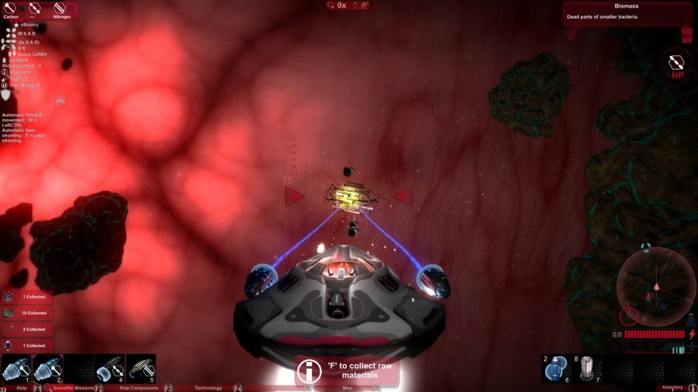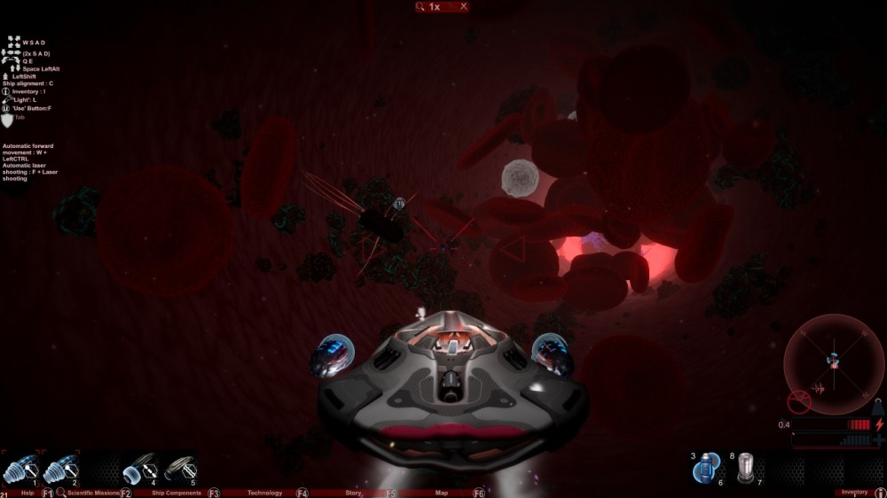 Корабль нуждается в воздухе и топливе, чтобы системы исправно работали. Мертвые микробы или кровь позволяет добывать ресурсы и минералы. Юзер способен создавать щиты, двигатели, лазеры, вооружение и компоненты для флота. Обновляя программное обеспечение судна, можно повысить скорость и уменьшить потребление энергии. Пациент быстро умирает, а центральному персонажу понадобится выяснить, из-за чего лекарство от рака плохо действует.