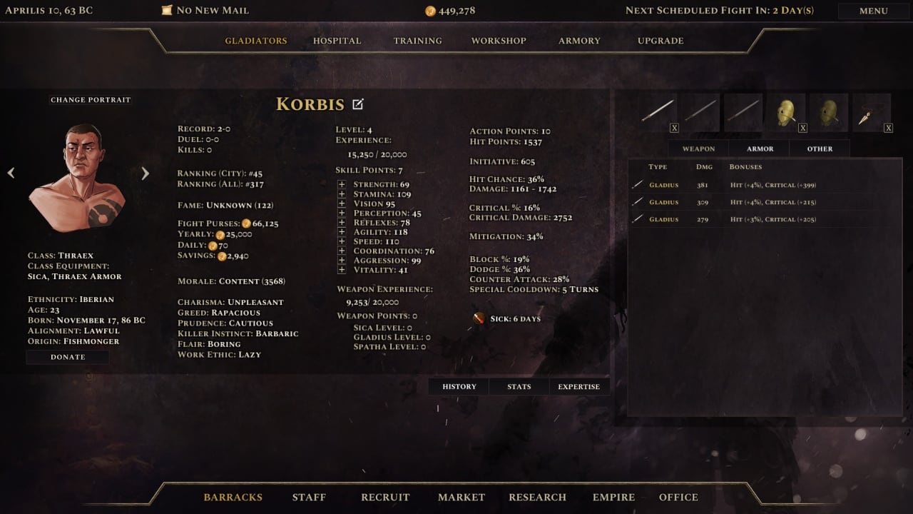 Инструкторы помогают быстрее развиваться юнитам, а врачи следят за их здоровьем. Бойцы содержат множество параметров, влияющие на исход матча: боевой дух, усталость, физическое здоровье и т.д. Прокачка состоит из 5 веток: боевая, медицинская, оружейная, защитная и разведка. Всем воинам можно задавать уникальные имена. Геймплей позволяет проводить ставки в букмекерских конторах, позволяющие поднимать огромный капитал. Чем известнее боец, тем выше будет ажиотаж и ставки. Игра содержит множество рандома и процедурно генерируемых уровней.