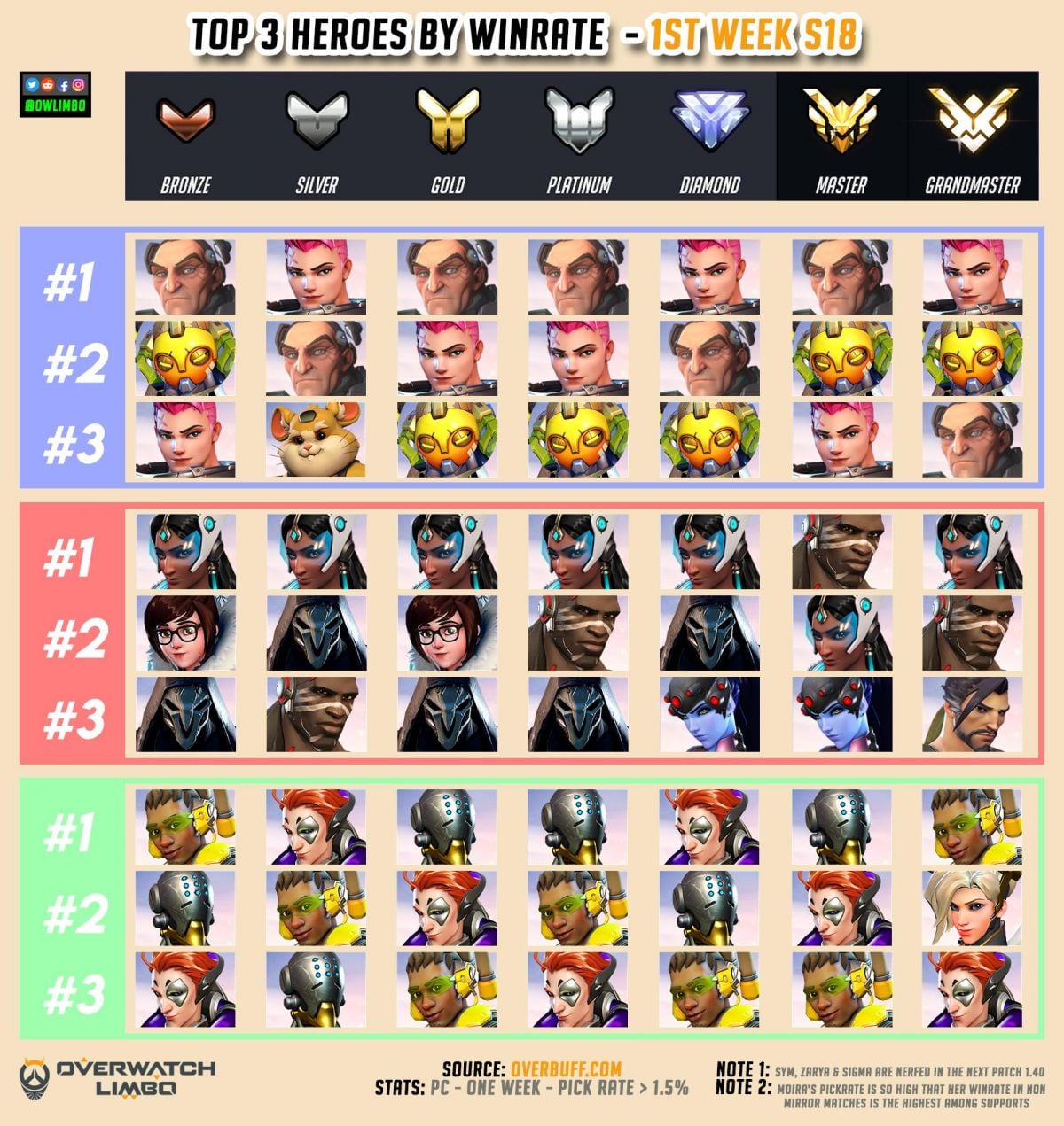 Персонажи могут применять различные способности: перемещаться во времени, ставит вокруг себя защитный барьер и т.д. В зависимости от героя меняется стиль игры и каждый участник вносит свой баланс в соревнование. Бойцы делятся на три разных класса: Урон, Танк и поддержка. Ростер участников представлен такими героями, как D.Va, Ана, Ангел, Бастион, Бригитта, Жнец, Заря, Крысавчик, Кулак Смерти, Мэй и другими.