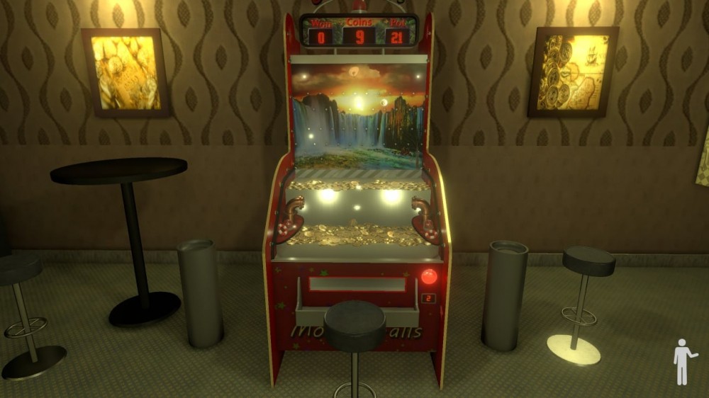 Пользователь выбирает режим, меняющий основную цель, а после перемещается к игровому автомату. Потребуется взаимодействовать с частями на устройстве и толкать монеты. Сверху на счетчике указано, сколько денег было выиграно, брошено и потеряно. Два рычага будут отталкивать объекты, а те попадать в разные части на области. За счет этого выходит определенный счет и количество победных очков.