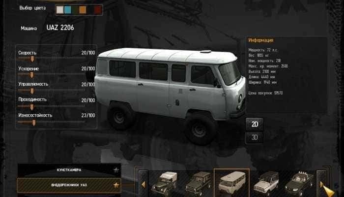 К примеру, используя пониженную передачу, зачастую, можно преодолеть любые препятствия. При этом в игре грамотно реализована физика повреждения. Достигнув определенного уровня повреждений, можно смело забывать про любые соревнования, пока не осуществится ремонт транспорта. Деньги на починку и прокачку зарабатываются через победу в гонках. В машинах можно прокачивать различные элементы: двигатель, трансмиссию,защитный каркас, лебедки и другие элементы. Марки машин представлены только производителем УАЗ, но все виды авто, что есть в игре - прототипы существующих машин.