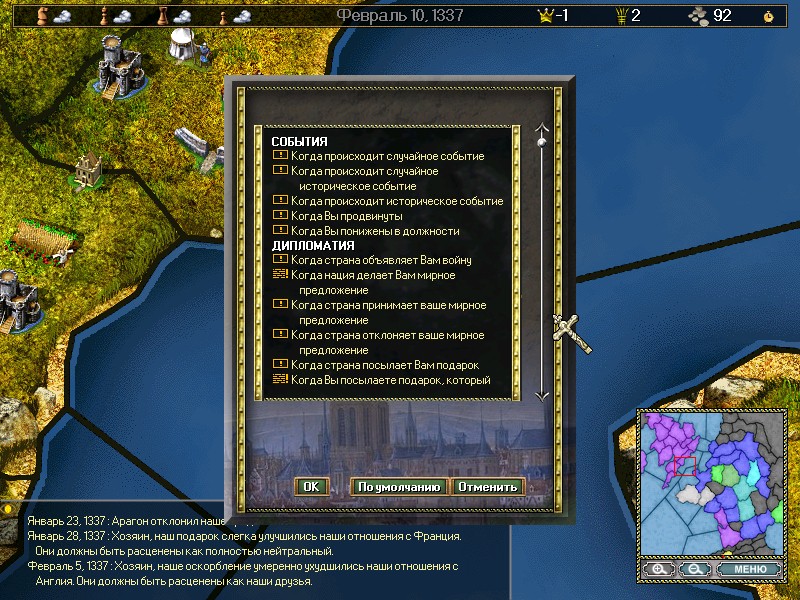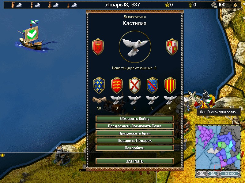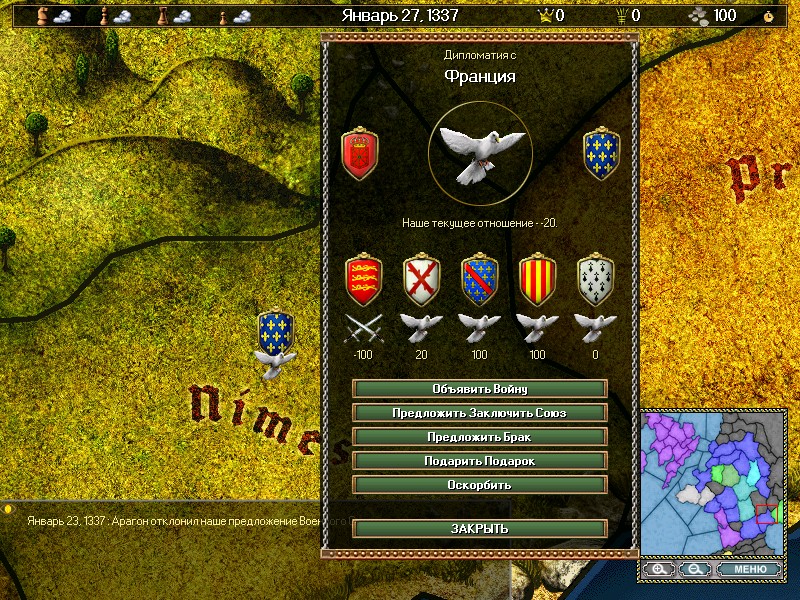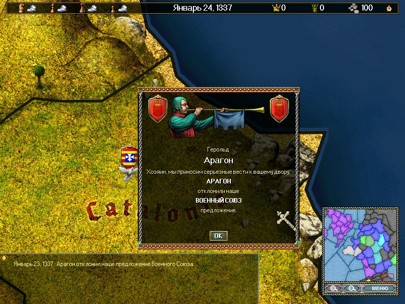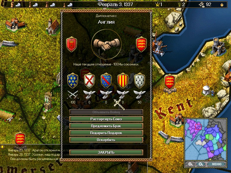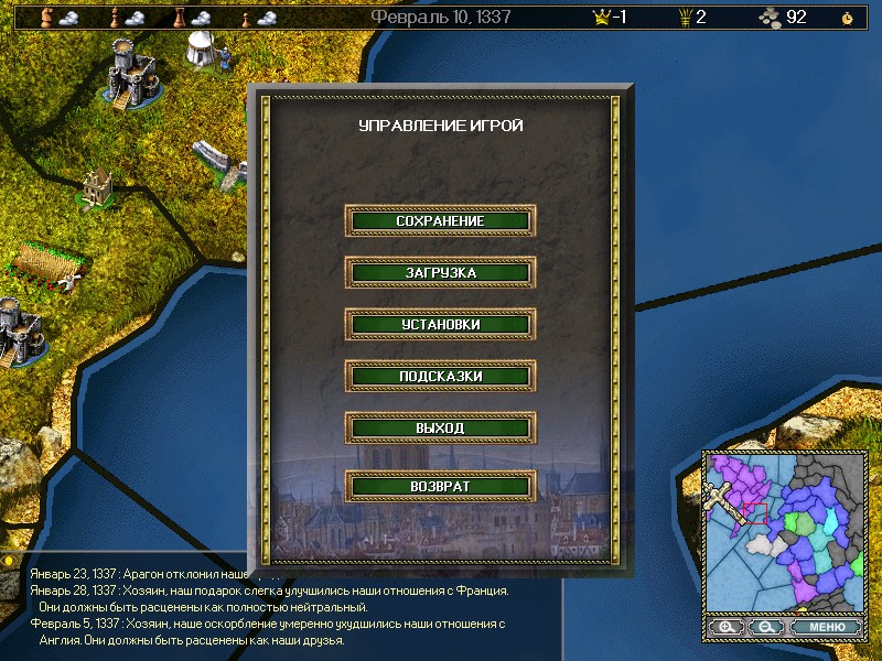 Занимайтесь экономическими вопросами, формируйте армию и флот, добывайте ресурсы и стройте здания. Доступно 4 класса юнитов: крестьяне, дворяне, духовенство и обычные граждане. Чтобы победить в битве, необходимо набрать максимальный балл, либо объединить под своим началом все окрестные провинции.