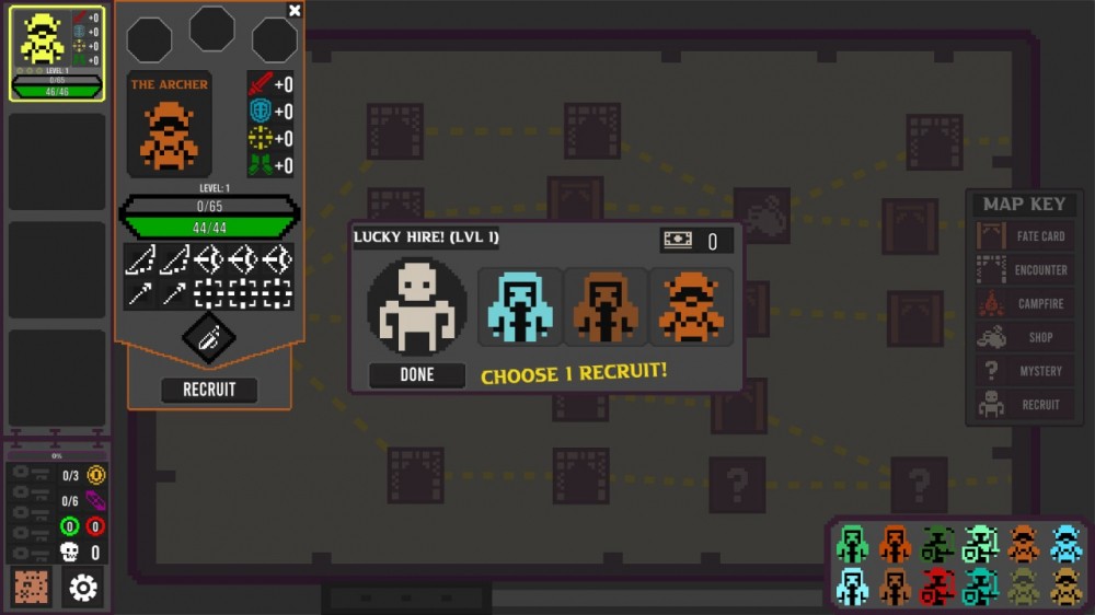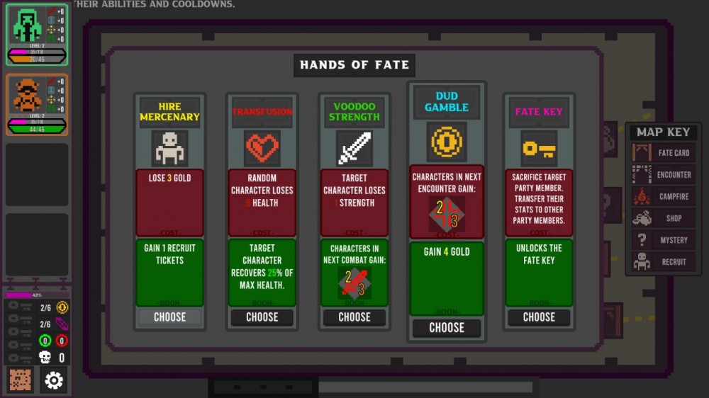При смерти одного из членов группы, юзерам предстоит вербовать нового. Каждый ход у всех приключенцев будет появляться 3 способности, которые периодически смогут меняться. Пользователям придется принимать каждый ход правильное решение, чтобы получать желаемые навыки, подходящие под сложившуюся ситуацию на поле боя. В игре присутствует 24 героя для разблокировки, 30 видов врагов, 6 боссов, 100 карт судьбы, 40 реликвий и 26 уникальных арен, что будут генерироваться процедурным образом для повышения реиграбельности.